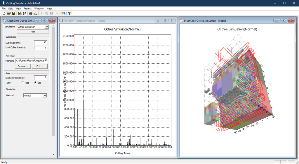NC코드 파일을 읽어와 그에 따라 절삭가공 시뮬레이션을 수행하고, 결과는 복셀로 표현하였습니다.